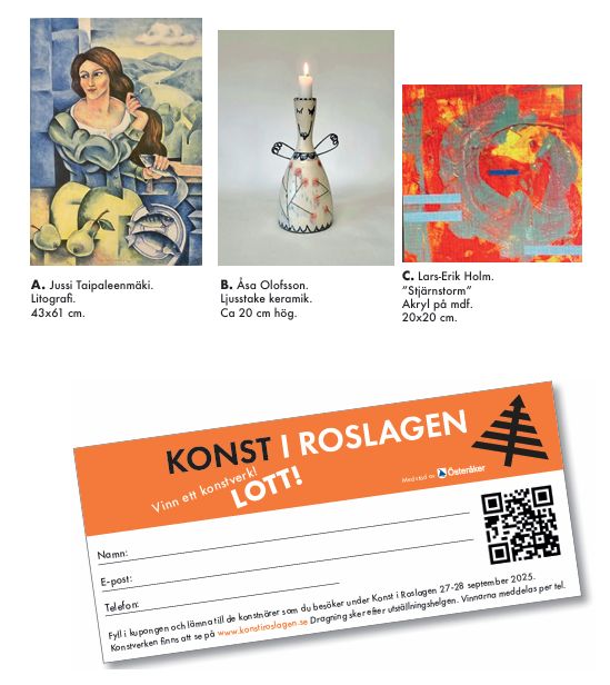 Några av våra konstnärer ska skänka ett verk. Fyll i en lott (som du får hos konstnären) och lämna lotten till någon av de konstnärer som ställer ut under helgen.